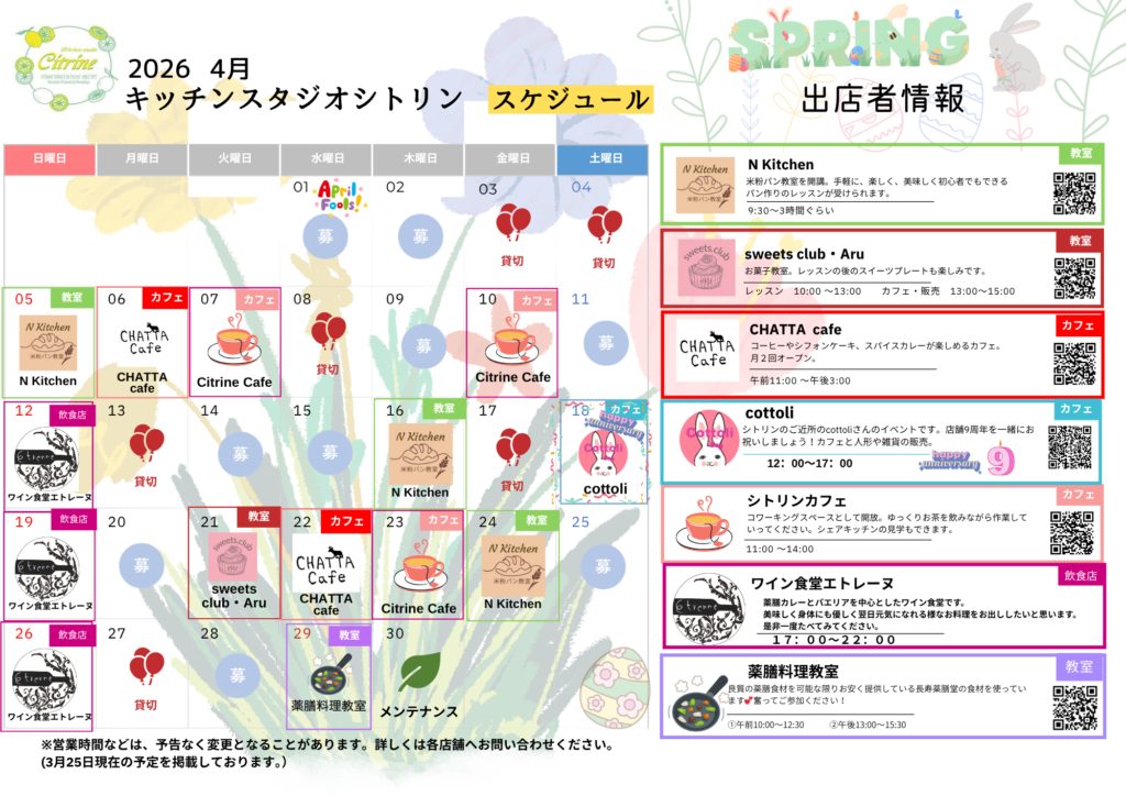 4月のシトリンカレンダー 2026 4/17 お知らせ 2026年4月17日 春のあたたかな陽気とともに、4月のカレンダーをお届けします。新しい季節が、皆さまにとって心地よいスタートとなりますように。 4月のカレンダー 皆様のご来店お待ちしております。 お問い合わせはこちらまで お問い合わせ お知らせ この記事が気に入ったら いいね または フォローしてね! Follow Me よかったらシェアしてね! URLをコピーしました! URLをコピーしました! 関連記事 2025年3月営業カレンダー 2025年3月1日 年末年始休業のお知らせ 2024年12月6日 2024年8月営業カレンダー 2024年8月1日 2024年7月営業カレンダー 2024年7月1日 2024年6月営業カレンダー 2024年6月1日 2024年5月営業カレンダー 2024年5月1日 2024年4月営業カレンダー 2024年4月1日 2024年3月営業カレンダー 2024年3月4日 コメント コメントする コメントをキャンセルコメント ※ 名前 ※ メール ※ サイト 次回のコメントで使用するためブラウザーに自分の名前、メールアドレス、サイトを保存する。